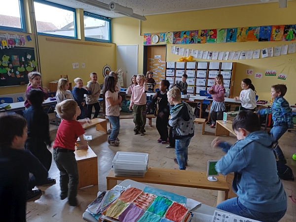 Ein echtes Highlight folgte, als die Patenklasse plötzlich zur Tür hereinkam – und zwar nicht mit leeren Händen. Mit einem fröhlichen Konfettiregen überraschten sie die Erstklässler und sorgten für staunende Gesichter, Jubel und ganz viel Freude.