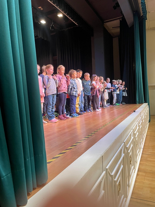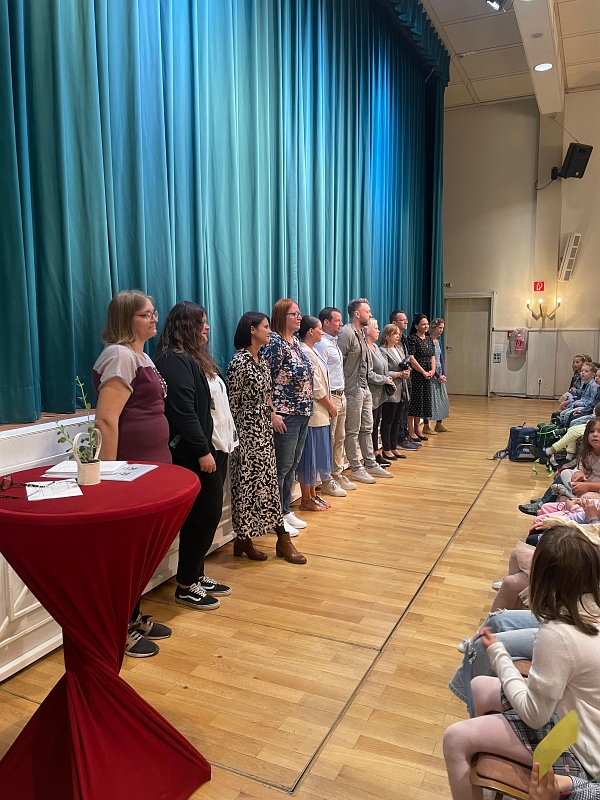 Die zweiten Klassen begrüßten die Kinder mit dem Lied "Alle Kinder lernen lesen" und nach der kurzen Ansprache von Frau Gutjahr durften die neuen Erstklässler sich zu einem von den zweiten Klassen vorgeführten Mitmachlied bewegen. Frau Woudstra, die evangelische Pfarrerin, war mit der Handpuppe Lucy gekommen und hatte eine Geschichte zum Schulanfang im Gepäck. Auch Frau Fischer, unsere Bürgermeisterin, war da und hatte sogar ein Geschenk für jeden ABC-Schützen dabei: Eine Theaterkarte für ein Kindertheaterstück in der Festhalle. Dann endlich ging es mit den Lehrerinnen Frau Noll, Frau Eckardt und Frau Peter zur Schule. Wir wünschen allen neuen Erstklässlern und ihren Familien einen gelungenen Schulstart.