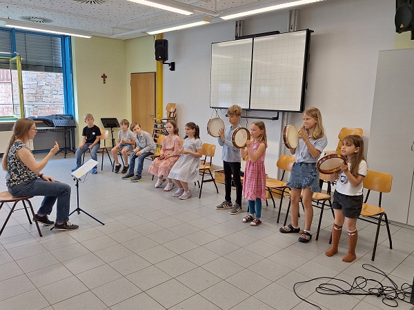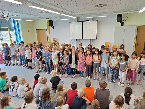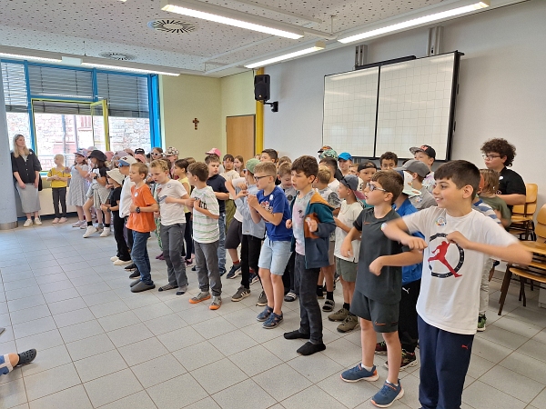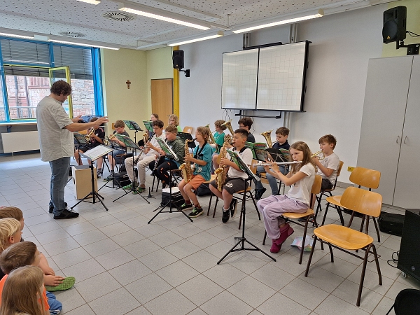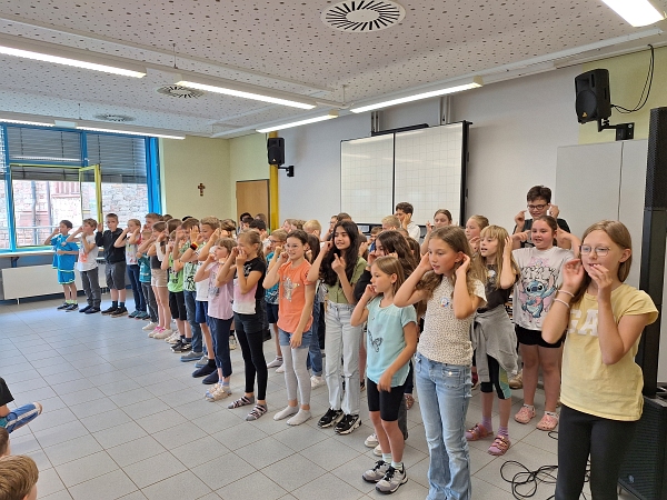 Eröffnet wurde der Aktionstag nach dem gemeinsamen Singen unseres Schulsongs mit sechs Stücken der Bläserklasse, die Herr Duzak vom Kahler Musikverein leitet. Danach sangen alle mit Begleitung durch die Orff-AG das Lied "Hallo! Grüß dich! Komm herein!". Das Lied wurde sogar im Kanon gesungen, der wunderbar geklappt hat. Gleich zweimal trat die Orffgruppe unter der Leitung von Frau Noll auf, die einmal ein Mitspielstück von Händel sowie das Musikstück "Le bascque" mit Orff-Instrumenten gekonnt begleiteten. Im Anschluss traten alle Jahrgangsstufen mit einem eigens einstudierten Lied auf: