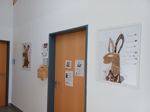 Vorgemalt wurden die Motive von Ylvie, Emma und Liya. Das Ergebnis: Drei bezaubernde Darstellungen des Sandhasen aus Kahler Erde und Kinderhand geformt.