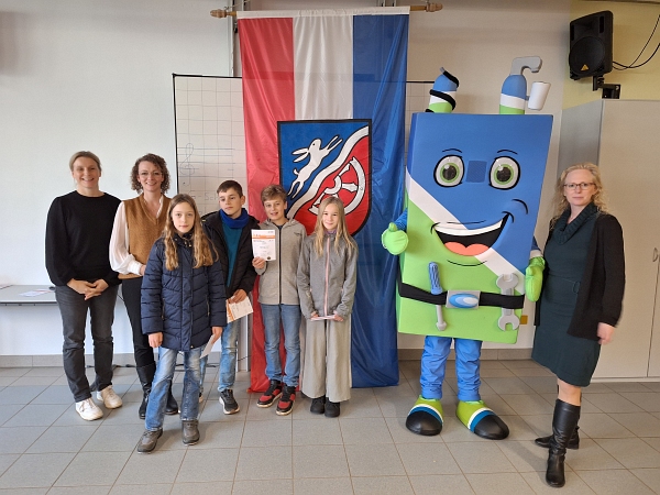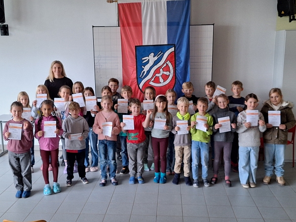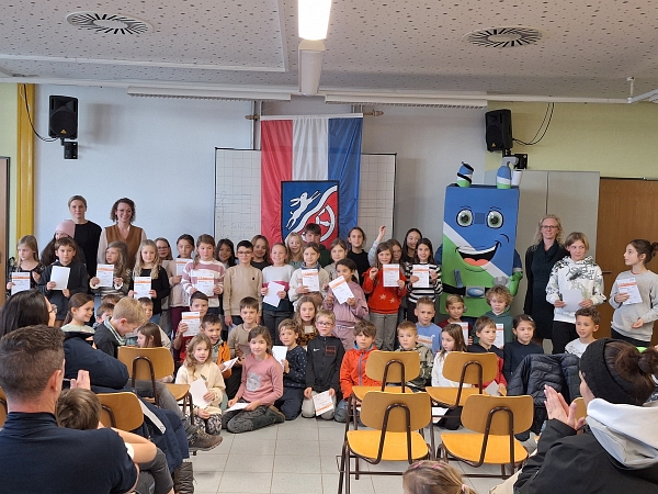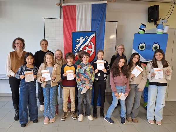 Der Raum war bis zum letzten Platz gefüllt und einige Personen mussten sogar stehen. Auch Frau Fischer, unsere Bürgermeisterin und SWEN, das Maskottchen der Gemeindewerke, waren unter den Gästen. Es war auch nicht verwunderlich, dass ein so großer Andrang herrschte, denn unglaublich viele Kinder hatten das Sportabzeichen durch intensives Training im Sommer geschafft. Frau Eckardt, die Sportbeauftragte und Frau Gutjahr gratulierten zu 34 Sportabzeichen in Bronze und zu 83 Sportabzeichen in Silber. 26 Kinder hatten sogar das Abzeichen in Gold erreicht. Herzlichen Glückwunsch an alle! Ein großes Dankeschön geht an die Gemeindewerke, die seit einigen Jahren die Anstecknadeln finanzieren.